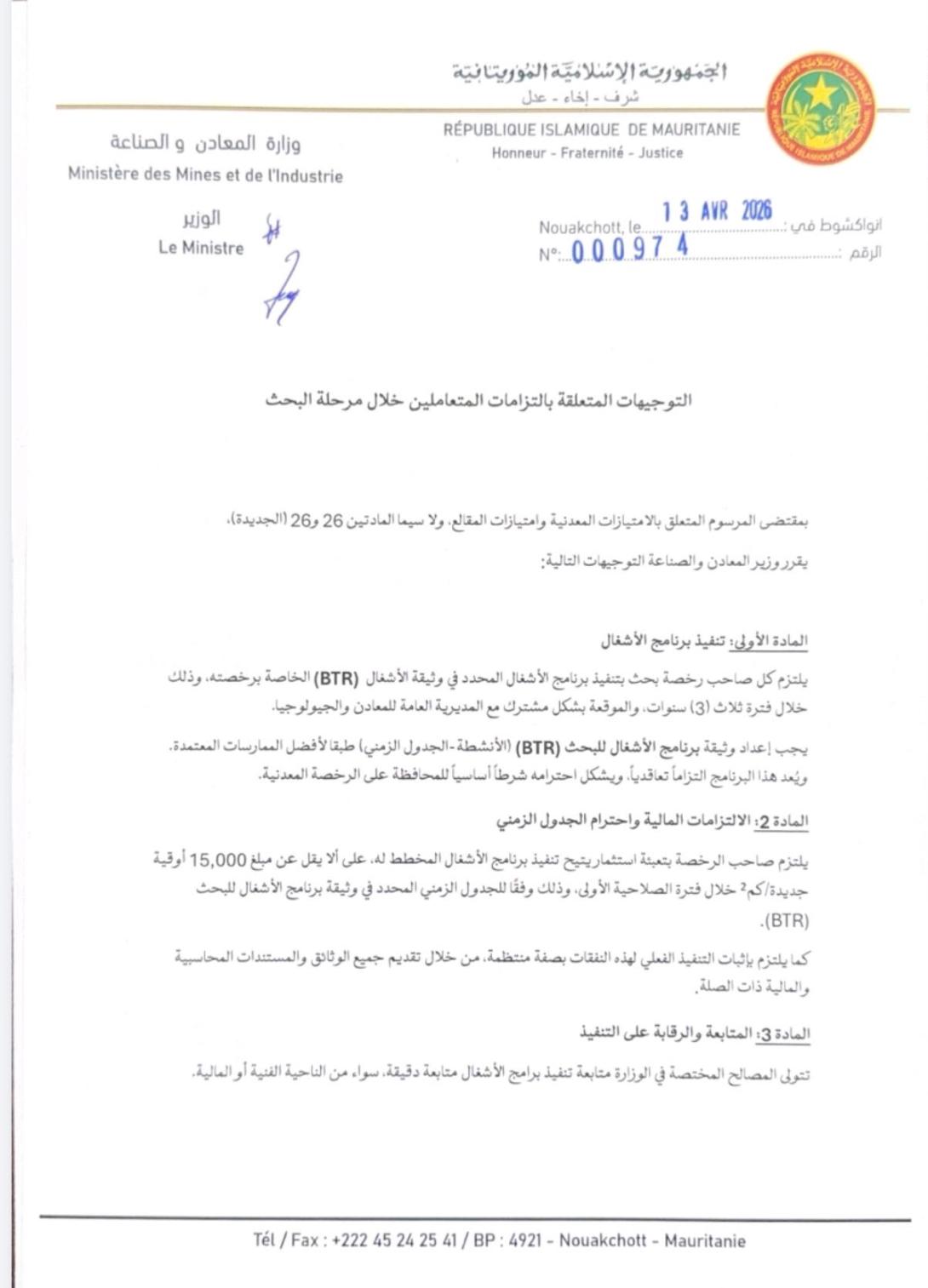 وبحسب هذه التوجيهات، نصت المادة الأولى على إلزام كل صاحب رخصة بحث بتنفيذ برنامج الأشغال المحدد في وثيقة برنامج الأشغال للبحث (BTR)، خلال فترة ثلاث سنوات، على أن تكون هذه الوثيقة موقعة بشكل مشترك مع المديرية العامة للمعادن والجيولوجيا. كما شددت على ضرورة إعداد البرنامج وفق أفضل الممارسات، مع تحديد الأنشطة والجدول الزمني، معتبرة أن الالتزام به شرط أساسي للحفاظ على الرخصة المعدنية.